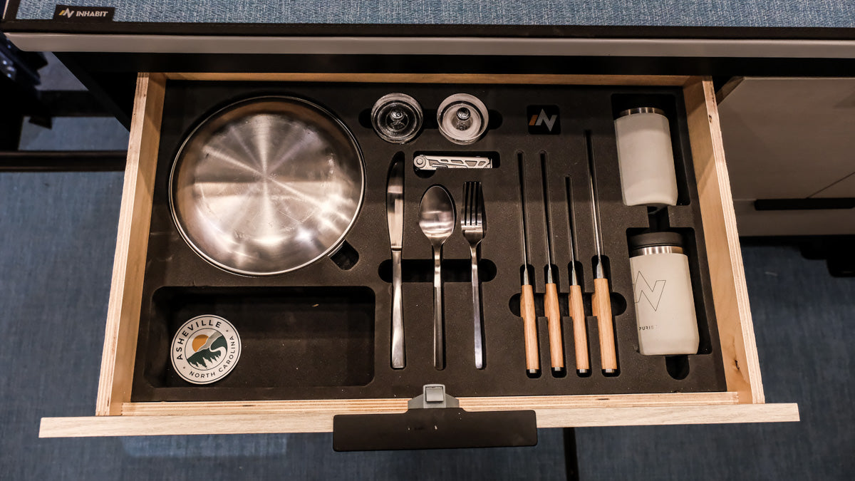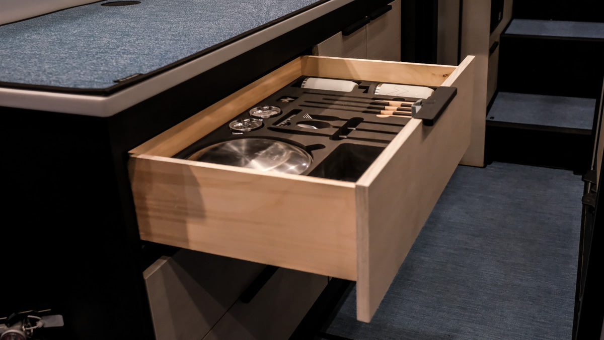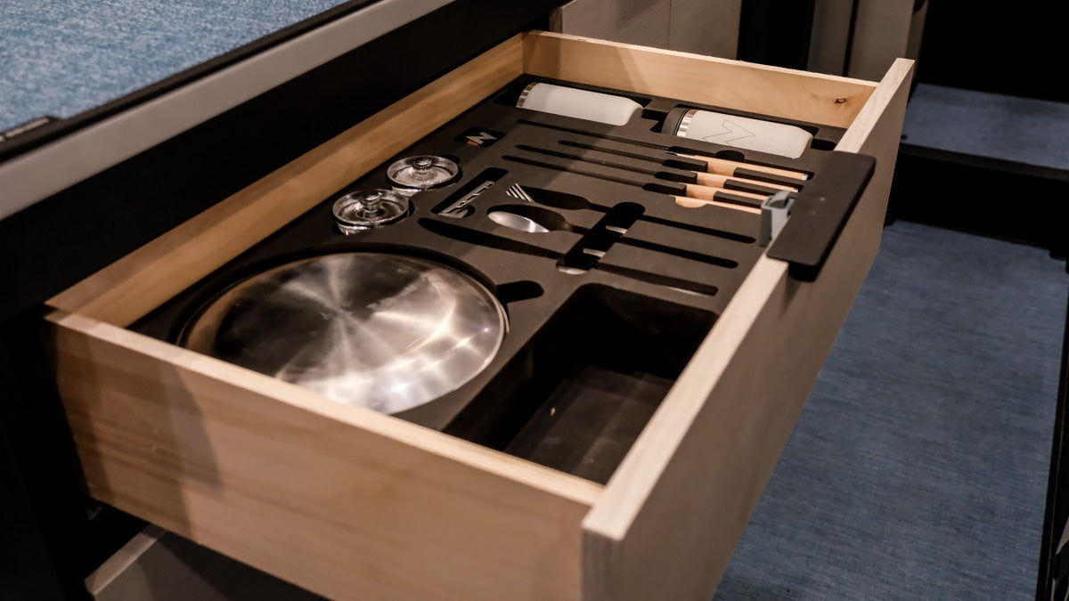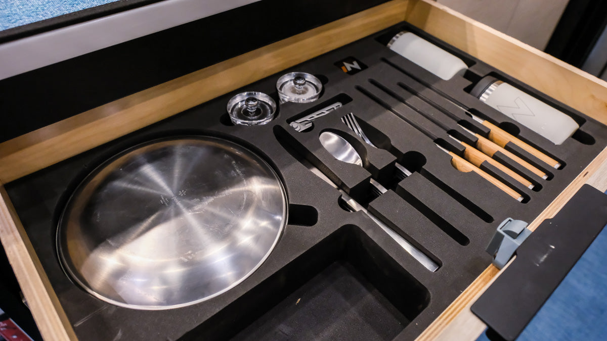 The Tiffin Open Trail Drawer Set occupies just one of your existing drawers. The insert is designed to fit snugly in the factory drawer. The contents consist of the finest implements available: Shun knives made from Damascus Steel, Purist insulated (glass-lined) cups with scoping lids, Peugeot salt and pepper grinders, Snow Peak plates and bowls, Gerber multi-tool, and Crate and Barrel flatware.