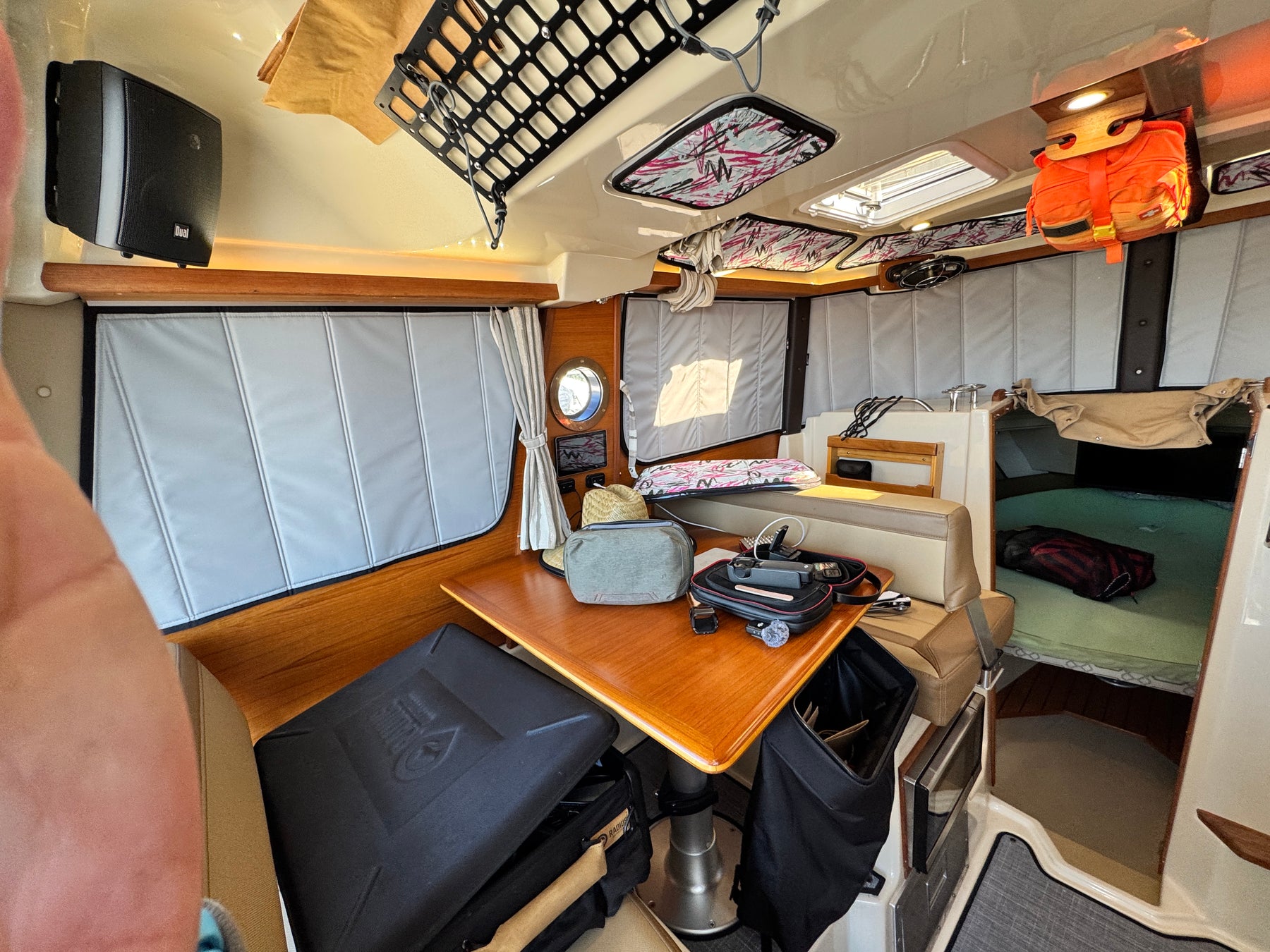 Interior shades help to keep out the heat and cool from the outside, and keep in your climate to make running the AC or Heater that much more efficient. This works in concert with solar and other charging means to extend the time away from the dock as well as improve comfort. We have noted approximately a 15 degree F temperature difference using these shades and the main window shades (coming soon) vs the factory window canvas and no hatch and skylight covers.