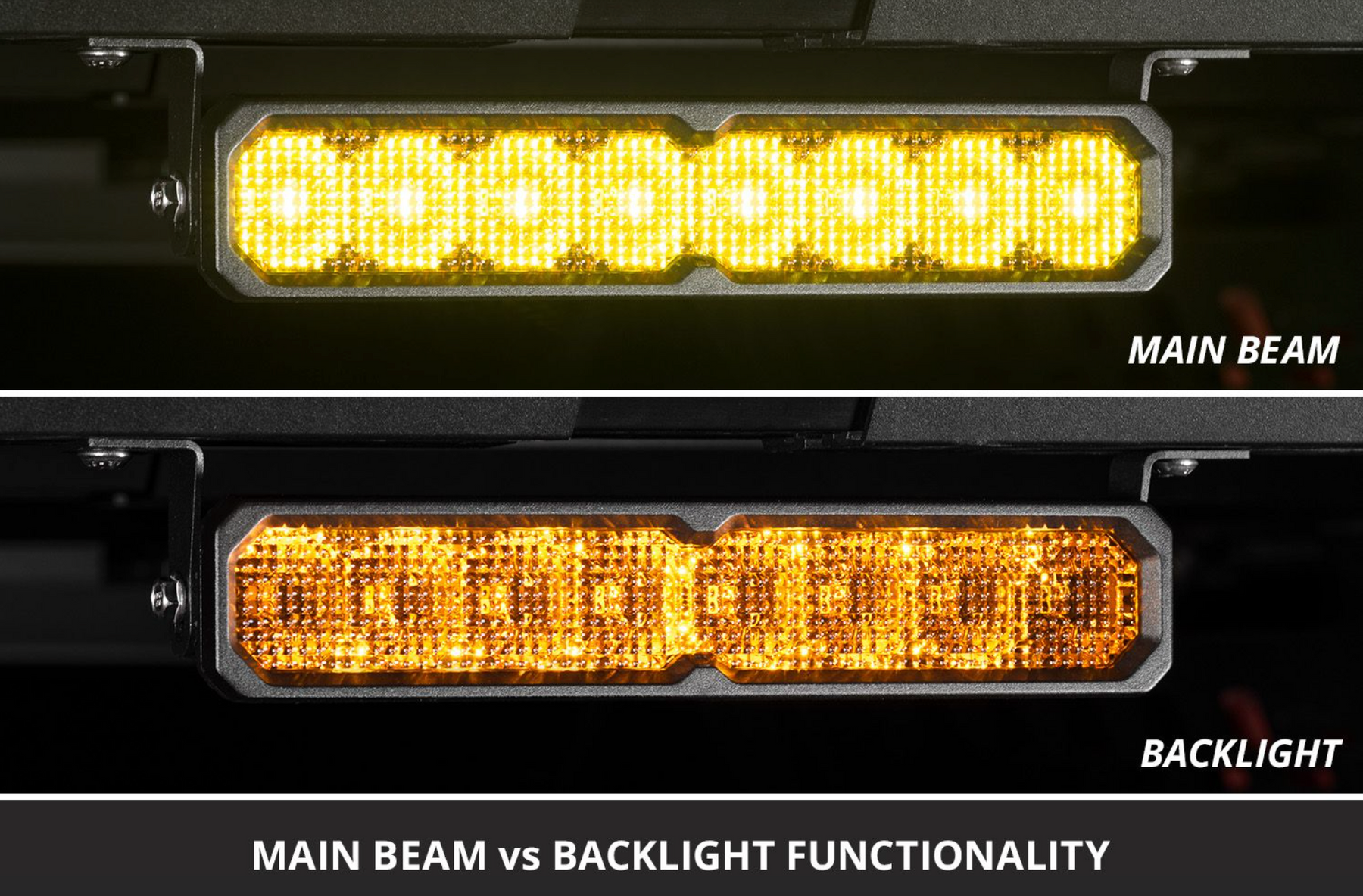 Fully Illuminated Backlight. All yellow Stage Series LED Light Bars now include an amber backlight that fully illuminates the TIR optic, providing unique accent lighting that you won't find on other LED light bars. This amber backlight is perfect for forward-facing applications to provide extra visibility to others when stopped on the trail.