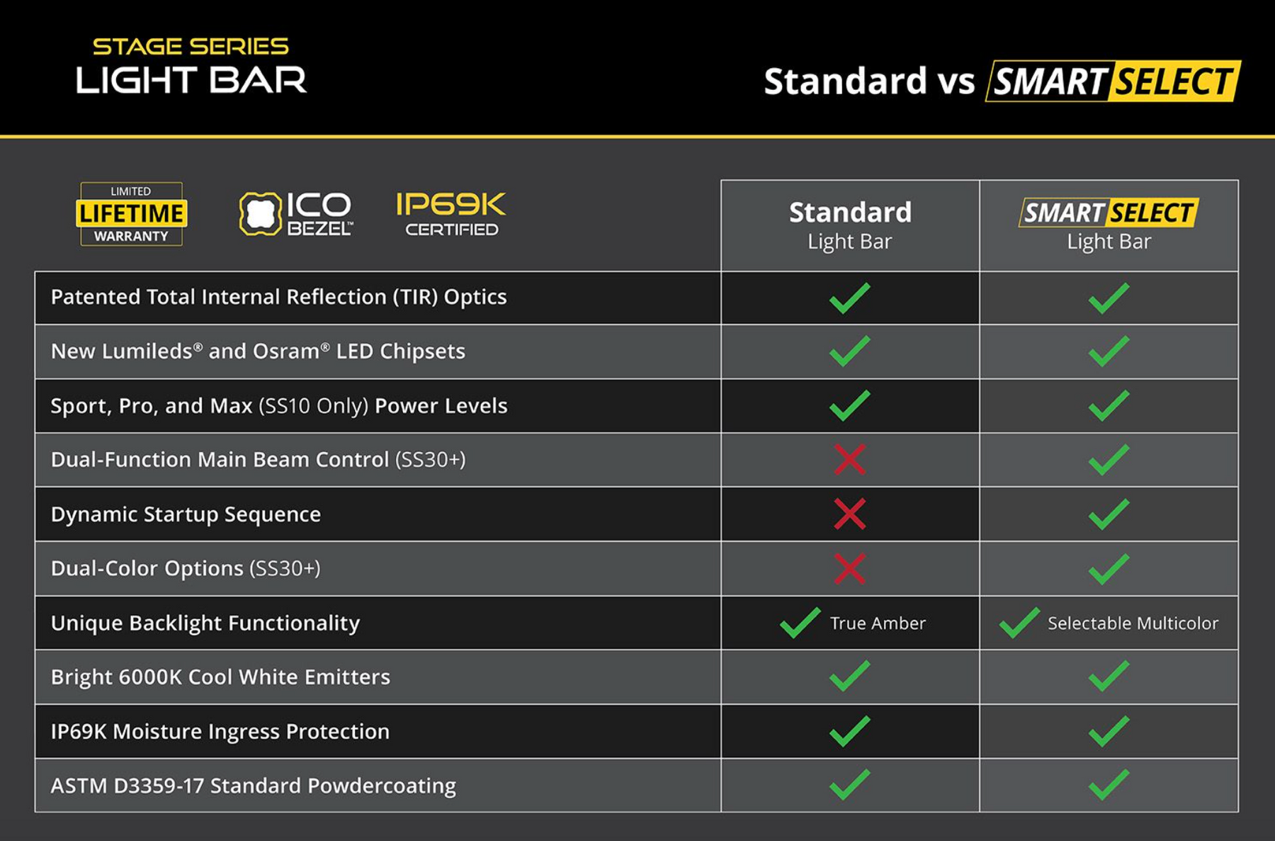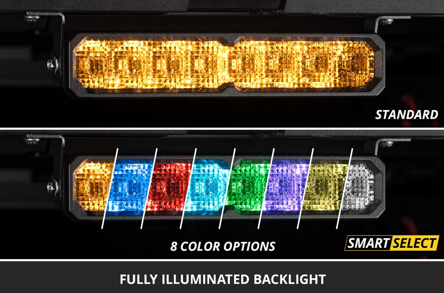 SmartSelect models feature a selectable multicolor backlight in your choice of eight colors, plus a dynamic startup sequence. Anytime the backlight on your SmartSelect light bar powers on, the selected backlight color, with the exception of amber, will sequence back and forth across the entire bar before fully illuminating, for a truly premium appearance. The amber backlight color selection has been upgraded to a dedicated amber chip, part of a full RGBWA series of LEDs, which perfectly matches the color of our smaller LED pods. This elevates the appearance far above other RGB or RGBW backlights on the market. Selecting your backlight color is easy - simply alternate the power on and off. There’s no complicated programming with a controller!