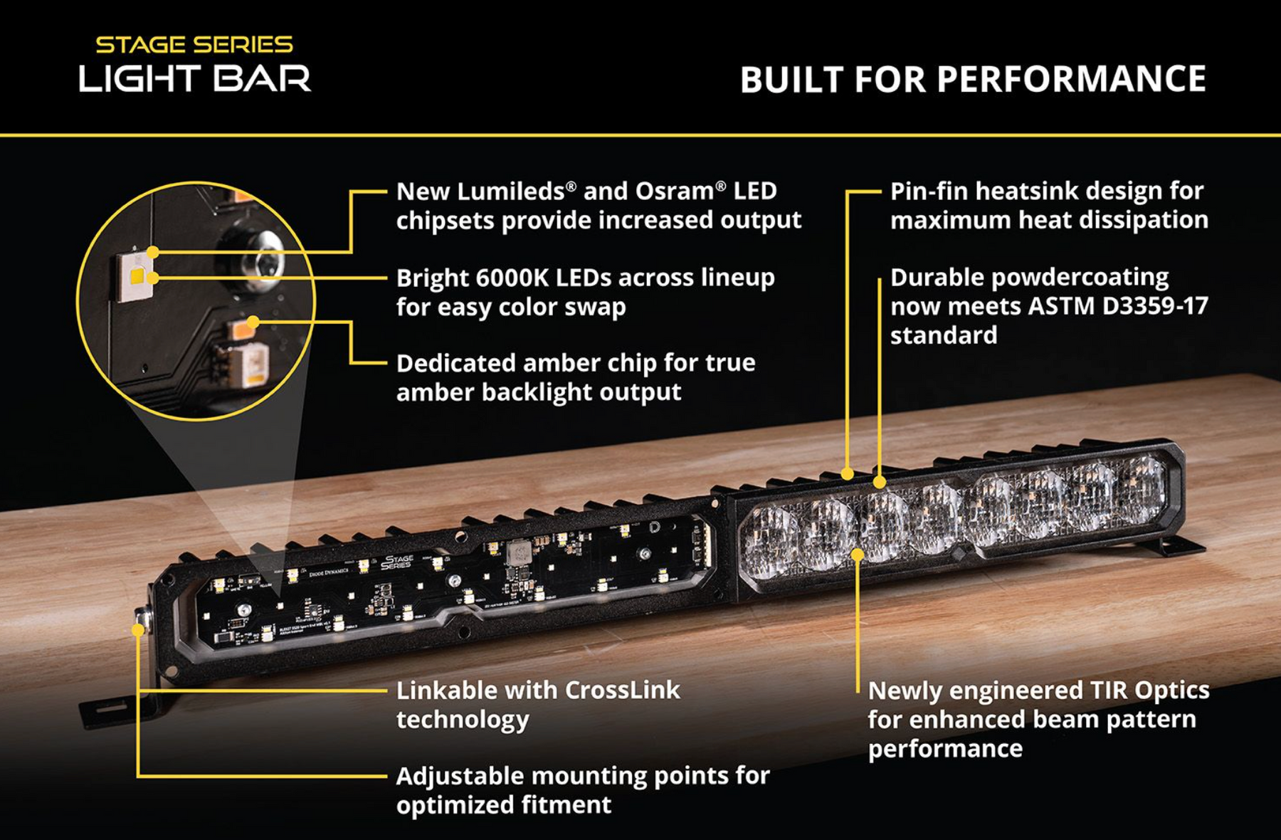 Designed for Performance. Each Stage Series Light Bar has been engineered from the ground up with the most modern optical, thermal, and circuit board technologies to provide more output than any other light bar on the market. Unlike reflectors, TIR optics capture and focus nearly all of the light output, shining it only where you need it, without glare or wasted light.