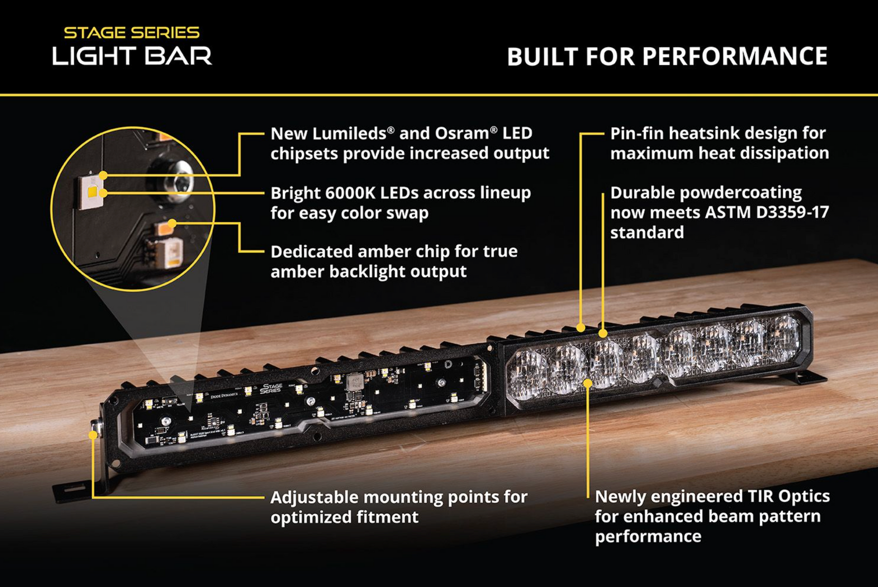 Designed for Performance. Each Stage Series Light Bar has been engineered from the ground up with the most modern optical, thermal, and circuit board technologies to provide more output than any other light bar on the market. Unlike reflectors, TIR optics capture and focus nearly all of the light output, shining it only where you need it, without glare or wasted light.