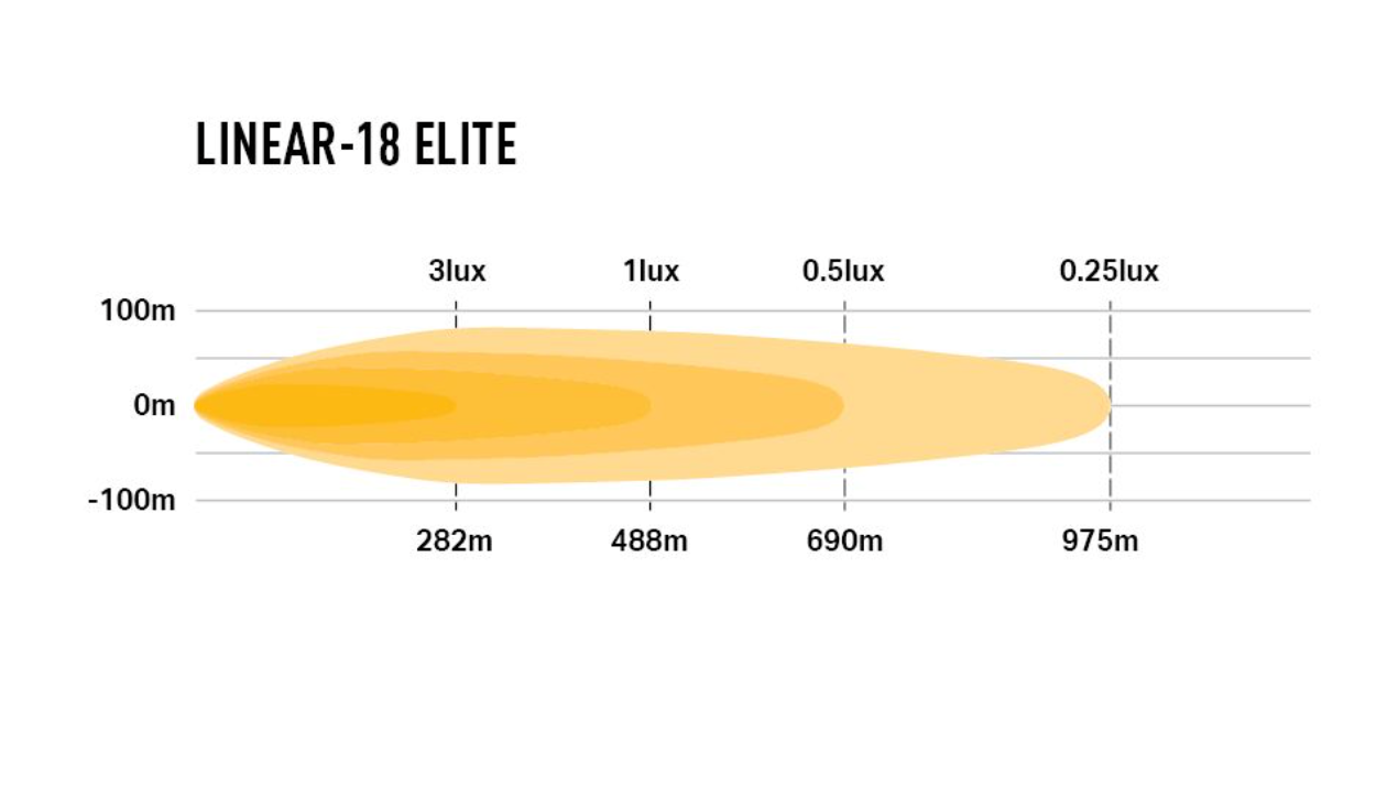 The Linear-18 Elite utilizes a combination of 36x highly efficient 3W LEDs which combine to deliver 12,150 raw lumens, and 1 lux to just under 488m. Impressive considering the lamp weighs 2.4lbs and has power consumption of 126W. Vacuum-metallized high-reflectivity optics are carefully designed and engineered in-house utilizing the latest CAD design and light simulation software, to deliver optimum light distribution in a drive beam pattern (64 degrees spread). The color temperature of the light at 5000K is carefully selected for its natural appearance proven to reduce driver fatigue. Integrated Daytime Running Lights provide a unique appearance to the light.