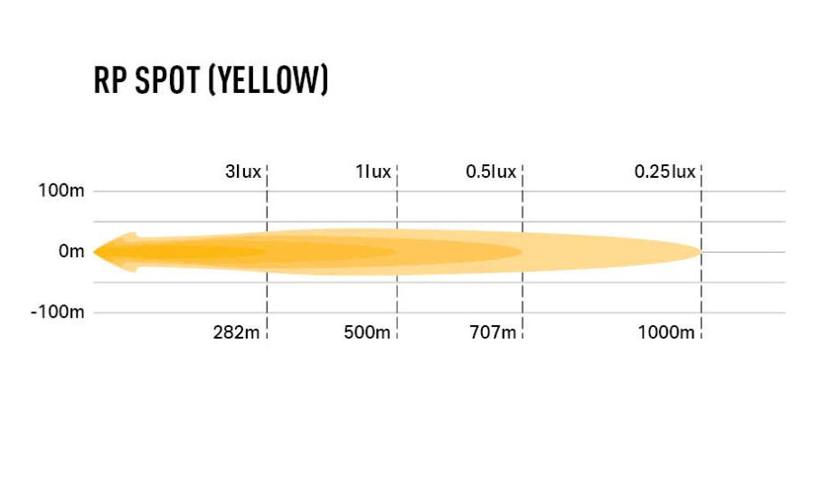 The RP Spot Yellow is an âoff-roadâ LED light built for performance and durability. Boasting 8x premium-bin 10W LEDs, the lamp produces 5,760 raw lumens which combine with the ultra-reflective, vacuum-metallised âboostâ optics specially designed and engineered to deliver light over an impressive distance (1 lux @ 500m), but still with 14 degrees left/right spread of light.