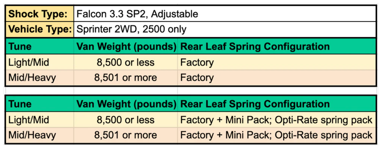 - Falcon 3.3 SP2 Fast Adjust rear shocks **custom tuned to the weight of your van for 2500 applications**